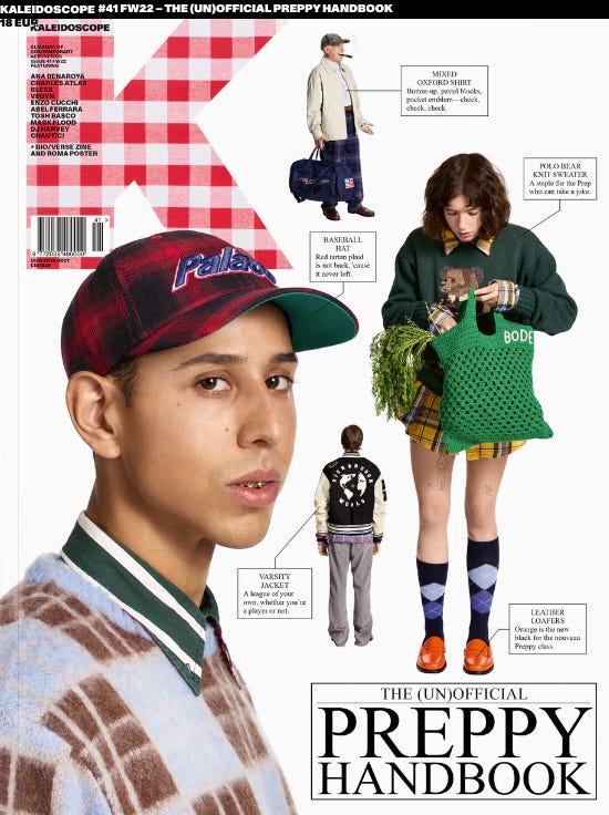 Look around at Thom Browne, Aimé Leon Dore, Michael Bastian’s Brooks Brothers, Brendon Babenzien’s J.Crew, or elements of Bode. They’ve all got some preppy in them. Or at least… they all have some version of Van Jacket’s version of streetwear’s version of Ralph Lauren’s version of Brook’s Brothers version of Ivy. It’s a style that is always here, and …it’s also having a moment. Look at the most recent cover of Kaleidoscope.