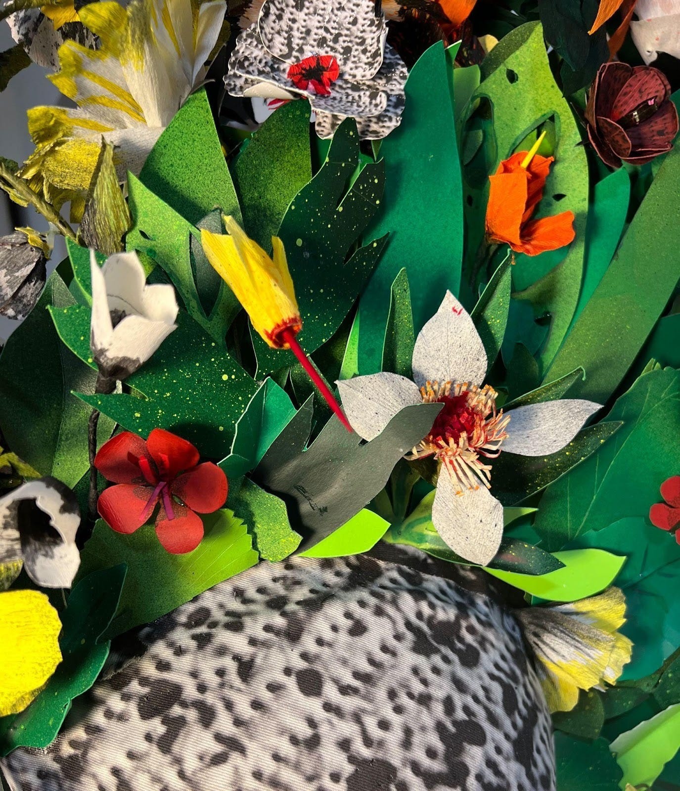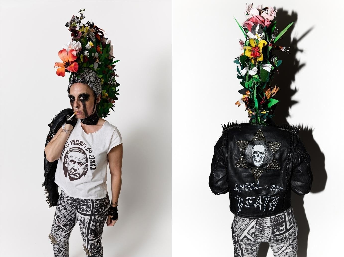 A fabulous punk ensemble requires a mohawk, so I began fabricating one made of flowers and leaves, to reference Passover’s marking of winter’s end. Over months I learned paper flower-making, the craft behind those large blooms on Anthropologie store walls. This old technique, often associated with women makers and dismissed by the art world, alchemized, in my studio, into a confident fine art object. Of course, unlike traditional examples, the Punk’s pulp-based blossoms visually embrace fury, covered in threatening nettles and doused with neon spray paint.