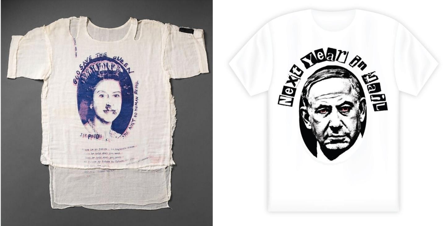 Pesach Punk’s pants and crown showcase an original black and white matzo bread pattern inspired by Westwood’s bold plaids. Her legendary “God Save The Queen” shirt gets an updated, Jewy nod as well. At the end of Passover meals, Jews traditionally collectively exclaim, “Next Year In Jerusalem!” My tee design for this character portrays Netanyahu rather than any monarch, his head crowned by the words, “Next Year in Jail.”