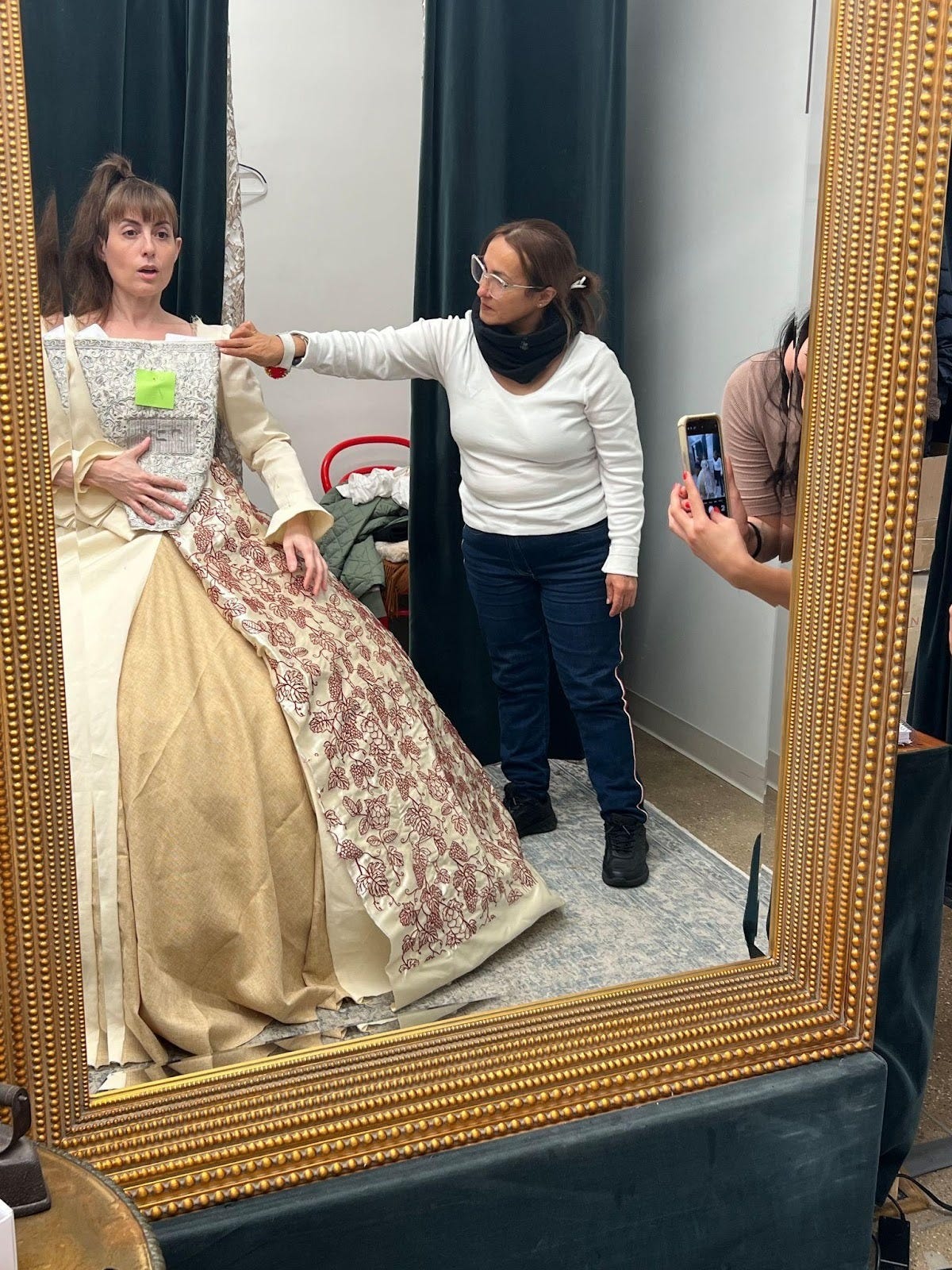 I next chose to use challah covers for the bodice and sleeve details. Embroidered challah covers, like many Jewish ritual objects, often copy ancient Christian royal aesthetics, making them a seamless visual fit for Tudor court fashion. Working with the wonderful artists at Flatiron Tailors, I created a gown made with embroidered fabric portraying candlesticks, challah, and kiddush cups alongside Elizabeth’s signature Tudor rose. Hundreds of fake pearls, Elizabeth’s signature jewel, each one adhered by hand, capped off the ensemble.