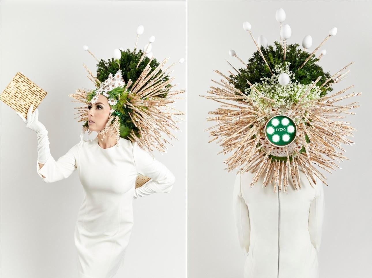 Over the course of 12 months, I constructed my tribute hat / costume, titled Taylor Bonnet. My headpiece appears deceptively similar to the one in BOOM! , but if you look closely, you can see it’s actually a celebration of Passover, made with matza wrapping paper, fake parsley, and many fabric eggs; all facsimiles of Seder table items. Knowing Passover, like Easter, celebrates spring, and the Last Supper was a Seder, this Pesach headpiece made for an ideal Easter Bonnet.