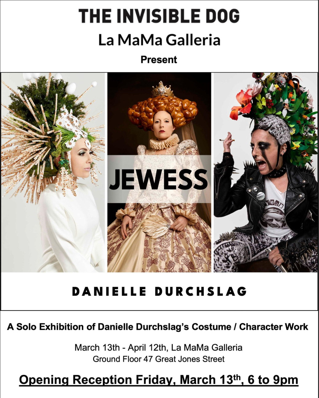 Danielle Durchslag is an artist and filmmaker based in Brooklyn, NY. A large solo exhibition of all her costume / character work described in this essay, titled JEWESS, will be on view this spring. Curated by Lucien Zayan and co-presented by The Invisible Dog and La MaMa Theater company, JEWESS opens the night of March 13th, 2026, from 6 to 9pm, at the La MaMa Galeria in Soho. RSVP here.