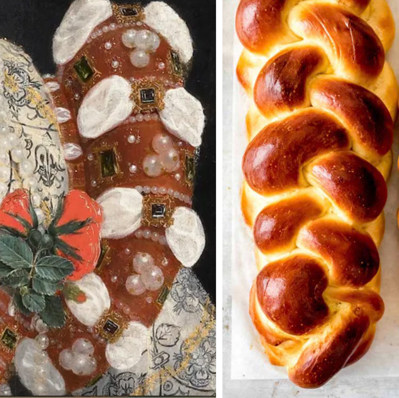 The protruding shoulder pieces in this painting reminded me of challah bread, so I decided to fabricate a headpiece for my new queenly character made of this blessed, braided carb.