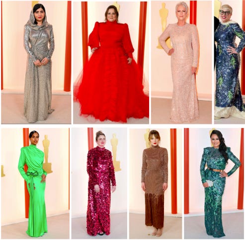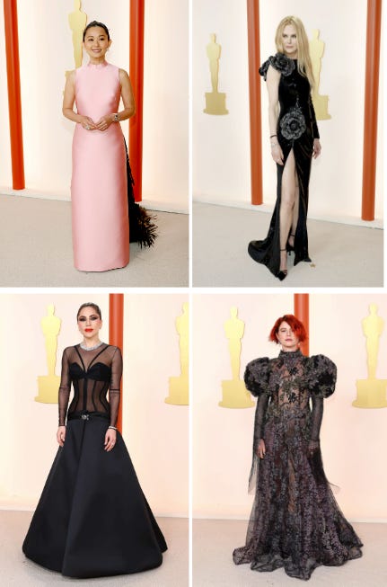 Some of Zahava’s Tier 3 picks from the 2023 Oscars were Hong Chau (“add sleeves”), Nicole Kidman (“add a second sleeve and close slit”) and Jessie Buckley (“add lots of lining; though this really strains the definition of ‘moderate’”), Lady Gaga (“same”)