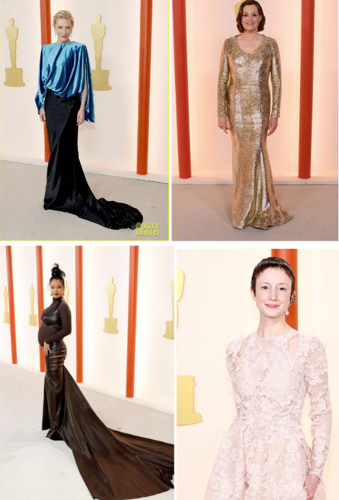 See - they’re close. Cate Blanchett would have to close those cap sleeves, Sigourney Weaver would have to raise that neckline a few inches, and Rihanna and Andrea Riseborough would need to add linings to make their dresses not-see-through.