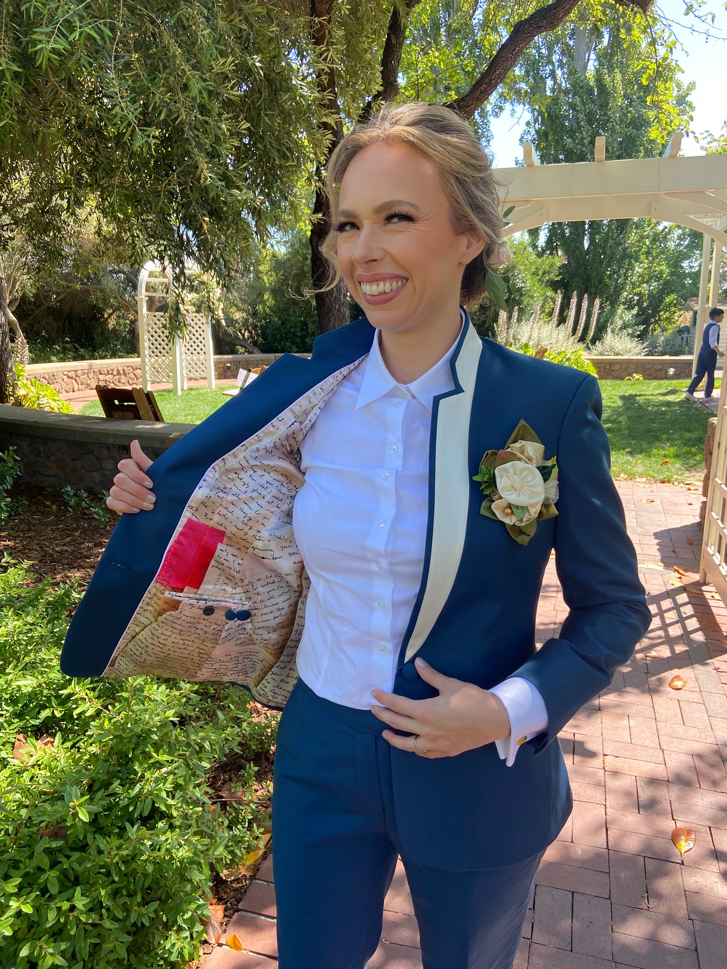 I just officiated my friends’ beautiful wedding (congratulations Anna and Vika!!!!) and I just had to share that Anna made a fabric out of her and her wife’s love letters… and then took it to queer tailor Thuy, who turned it into suit lining. How lovely is that?